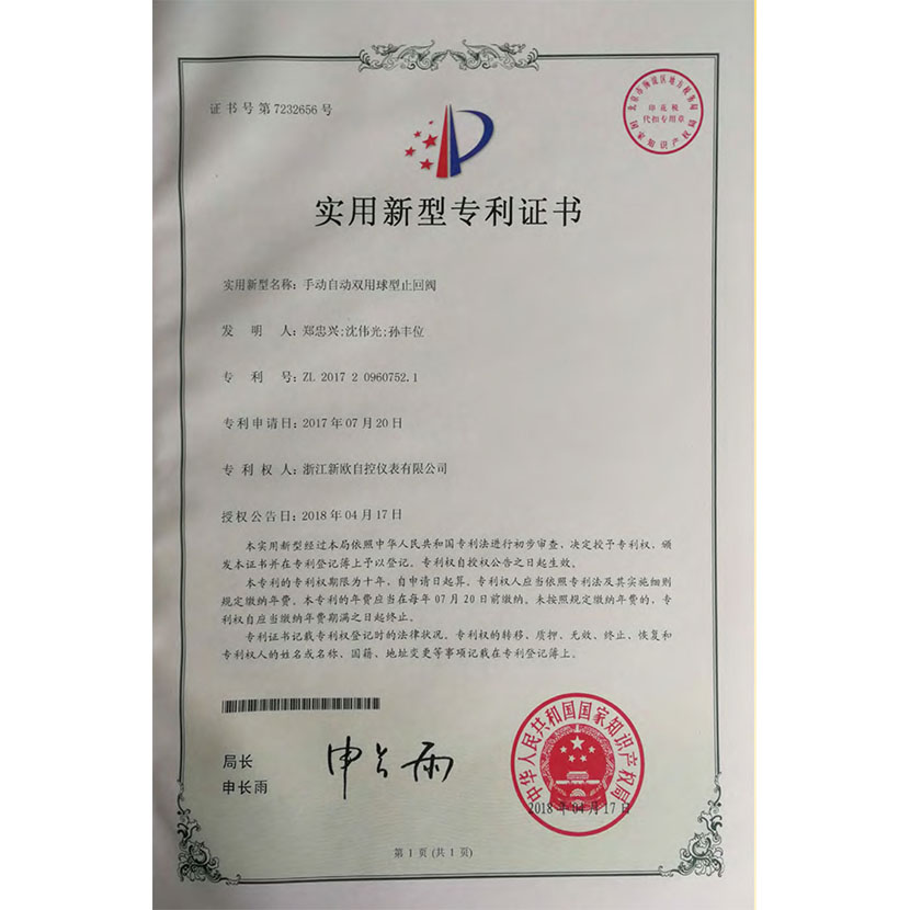 手動自動雙用球型止回閥 專利證書